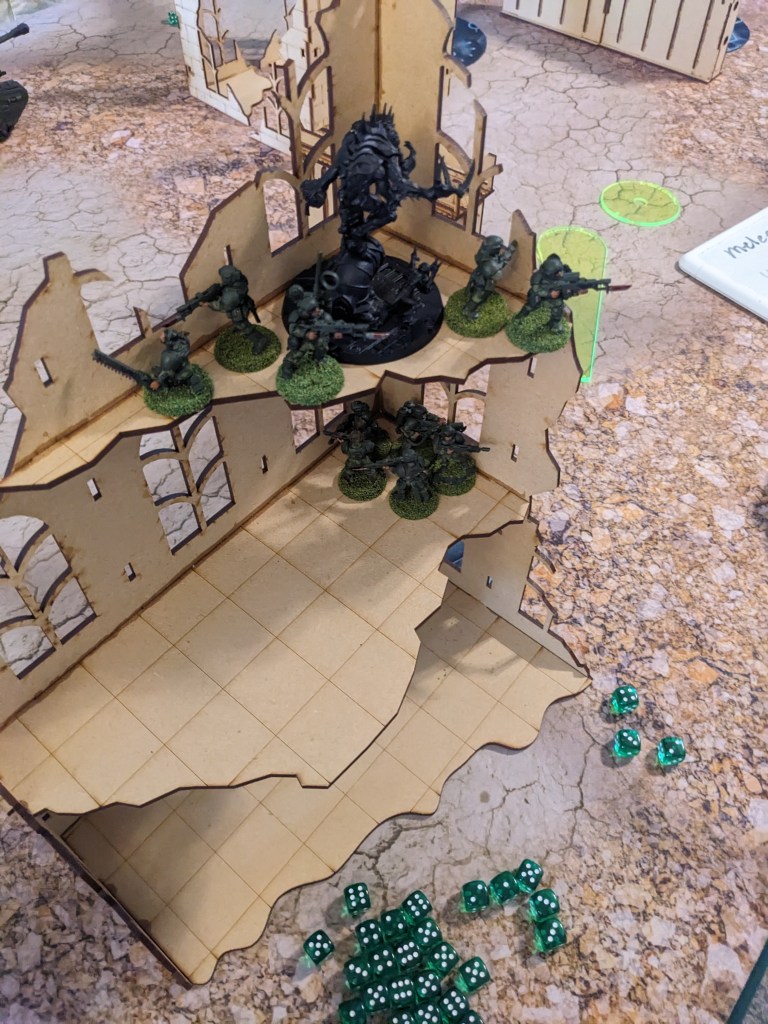 The Twisted Helix Patriarch took his throne to the highest floor of the abandoned tower to oversee the battle. We do not have a Primarch on Throne model, so this was proxied. He was accompanied by a retinue of Brood Brothers from the Pauper Princes to protect him.