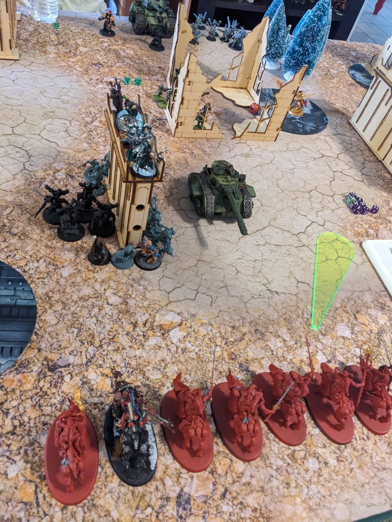 The Aquilons charged the Rogal Dorn and smashed it to pieces! They began moving towards the fighting on the South Flank to snipe characters.