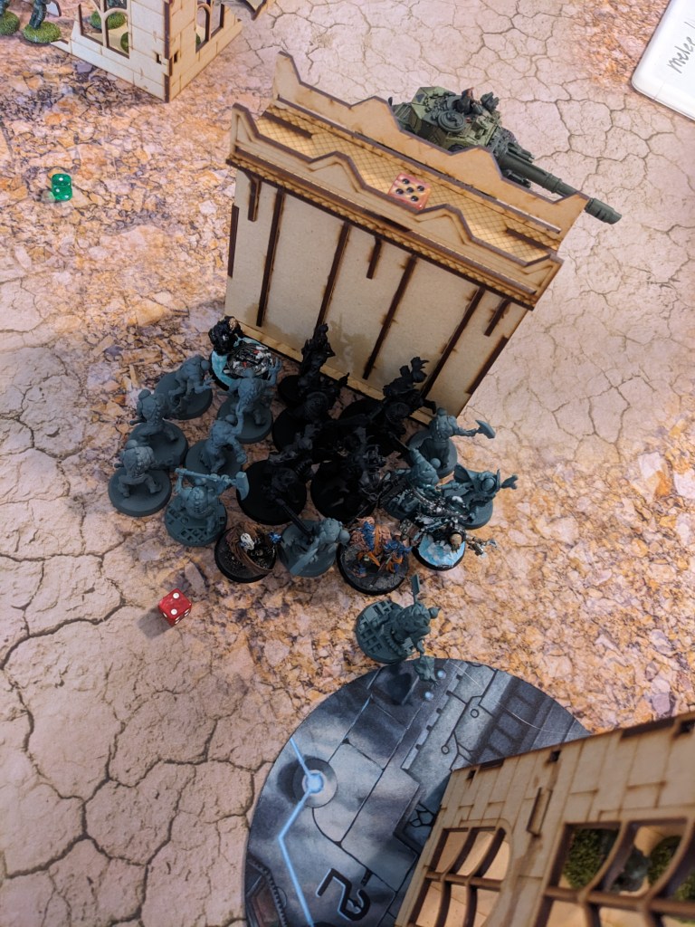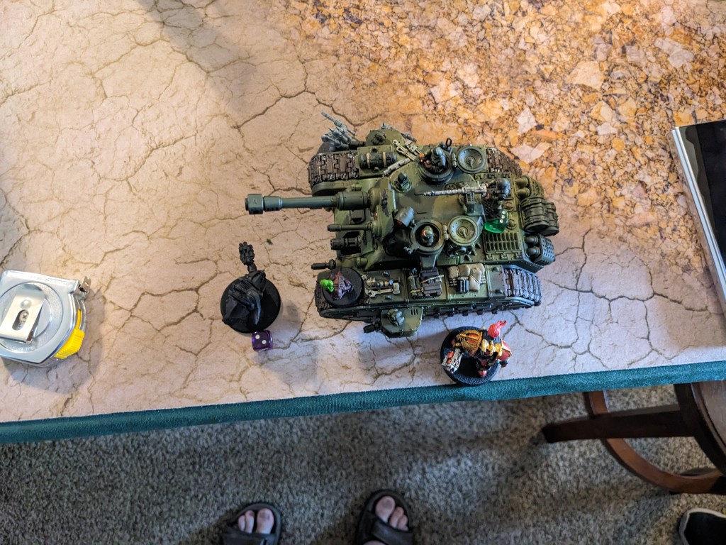 The Rogal Dorn had a bad day, but survived because it should have been a much worse day. With some astounding rolls made by Alex, he who defies the laws of chance with 1 in 3.6 million chances in Pathfinder, failed to do as much damage on the sides of the tank as the Jackhals did! The Rogal Dorn was still shredded and left with 6 out of 18 wounds, but it survived! It in turn began to retreat at the best possible speed of 1″ because the driver had been rattled around so many times by the Powerfists. In this process, he nearly killed the severely injured Aquilon and accidently ran over most of the Cultists. Unsurprisingly, everyone caught the tank that wanted to, but the Aquilons restrained so they could charge a weaker facing. The familiar was there for moral support in case anyone is confused. He is the captain now.