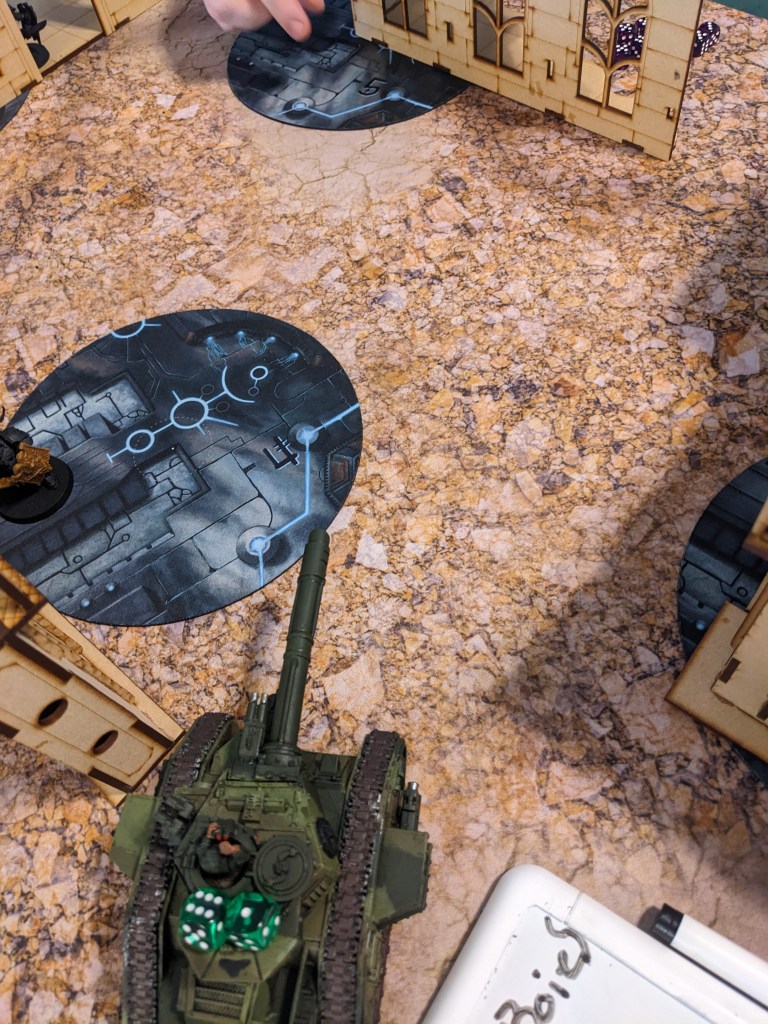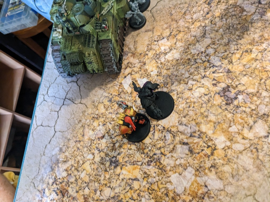 In response, the Captain grabbed his shield and bike, putting two Missiles through the front of the Tank Commander! One struck the cowling and knocked the Coaxial Stormbolter offline, and the other broke the ammo feed on the left sponson Heavy Bolter. Out of range, the two Guards hunkered down.