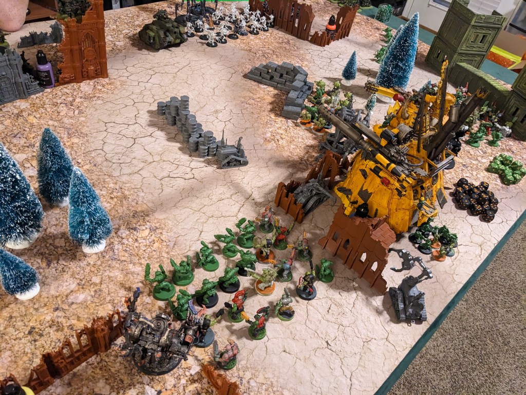 Daylight fully settled in the valley, and the guardsmen realized that maybe #stevethehuman was friends with tech heresy, but the battle was already to far pitched to try and ask him. Also, #stevethehuman was getting pummeled by the Stompa again, but he got up with a few of his friends. The Ork Boyz then charged, lead by their Warboss. Again, #stevethehuman went down, but he got better. The rest of the gunline was strafed with intense dakka fire. Multiple Rokkits hit the Not Canoptek Doom Stalkers again, knocking one over despite its advanced shielding. A unit of Guardsmen were charged, but the Commissar cut down the Nob Boss in a duel and the Sergeant slew several with his Chainsword. They held the line!