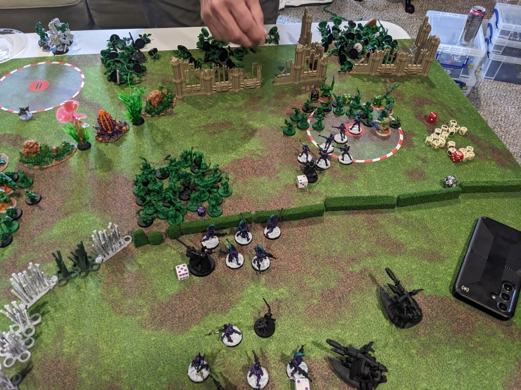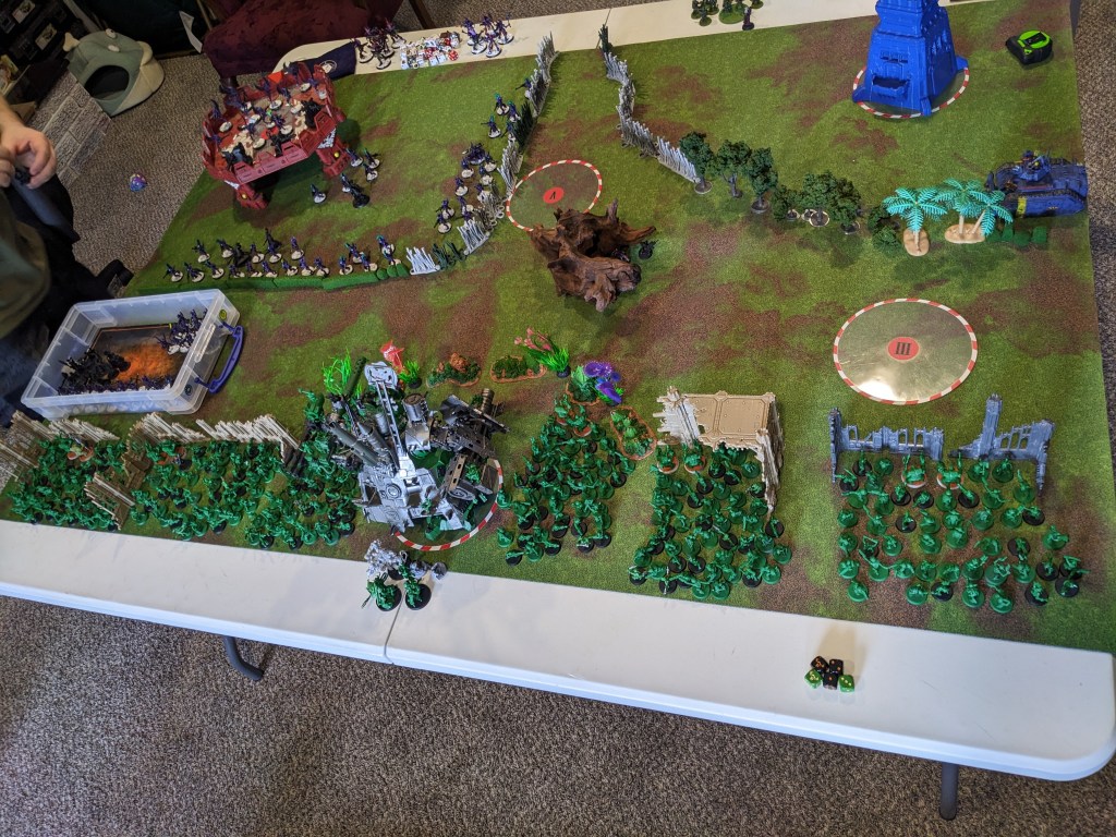 Forgot to take more pictures, but the jist of it is The Eversor rampaged through many, many Grots, but the Eldar gunned him down with an absurd amount of Shuriken fire.
