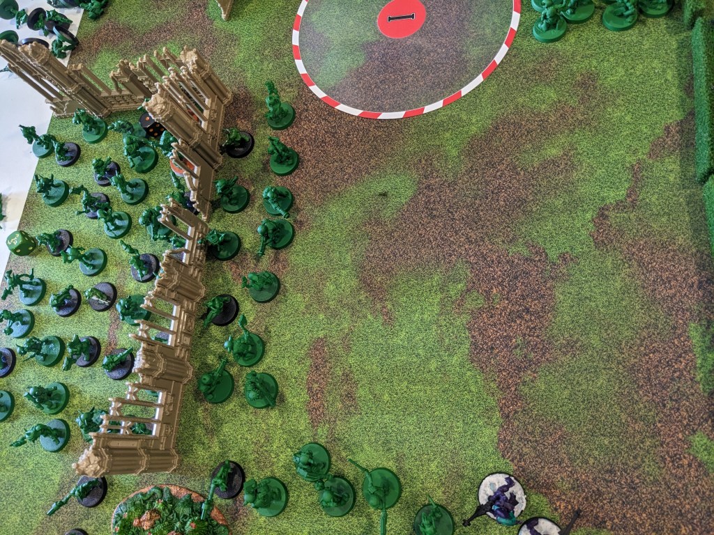 The Orks deployed first, taking the far bank and then filling it with Buzzgob in his Stompa and 288 Grots and 12 Runt Herders!