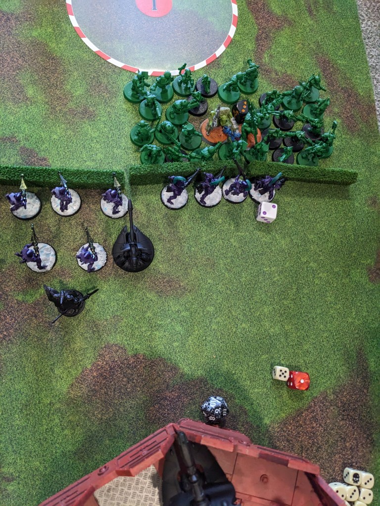 Previously off pictures the second Orbital Strike forced the Eldar Shadow Specters to move, ruining their effectiveness so they shot at Grots with their assault weapon mode instead of a second volley of Prism Fire into the Stompa. I needed them to not get any funny ideas about my Assassins or Chimera.