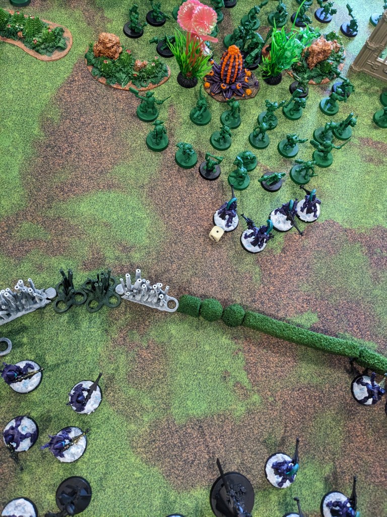 Grots piled over through the dry creek bed and slammed into the Eldar. Alex rolled as he do and lost more than he should have. To be fair, this entire game we all had terrible rolls across the board so it was fairly even at least.