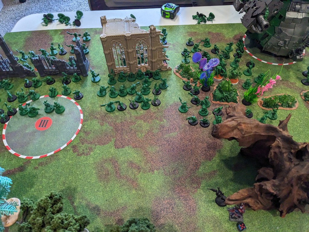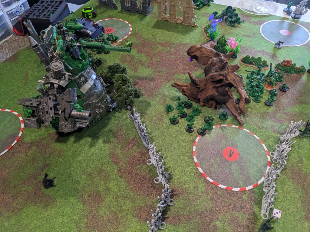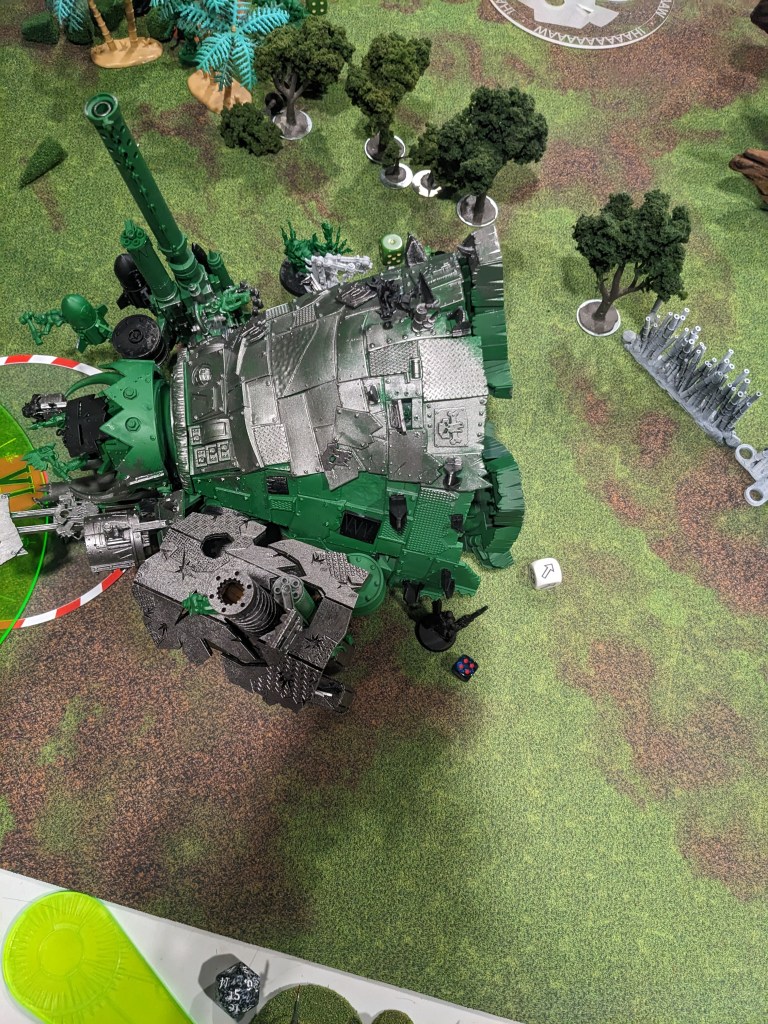 The Stompa moved to drop one of Buzzgob’s special assistants. For the first time this game it didn’t roll a 1 for Poor Maintenance and have to choose between moving or shooting. However, its engine was damaged twice so it could barely make it to a tree to crush it for the Demolition Objective.