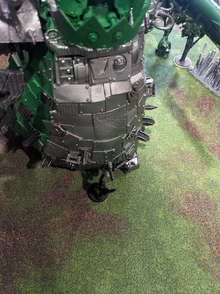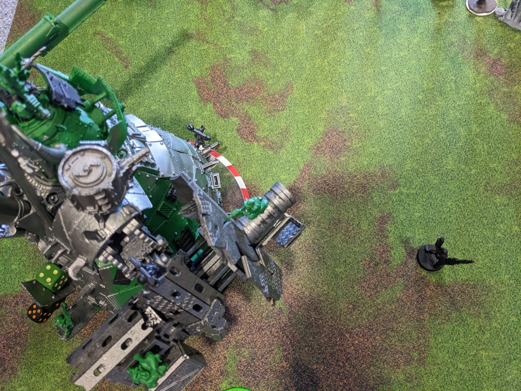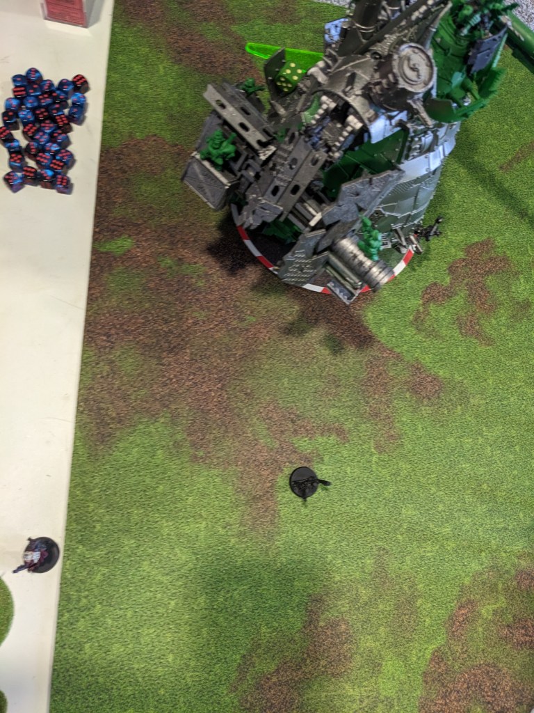 It charged the Vindicare! The Vindicare popped a Blind Grenade into the driver’s hatch, and then stabbed it with his Combat Knife! In turn the Stompa did 0 Wounds and lost Combat! It held because Titanics are Fearless, but still funny.
