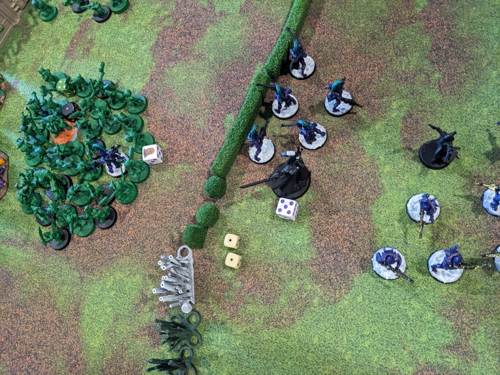 Meanwhile, the Grots broke through on the far flank of the Eldar as another hit the Guardian Defenders.