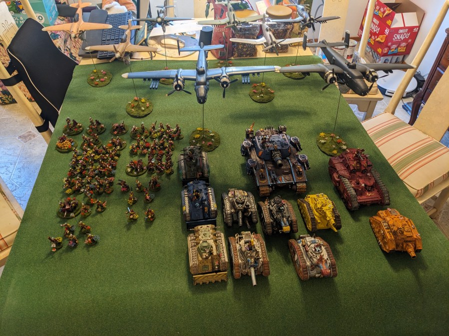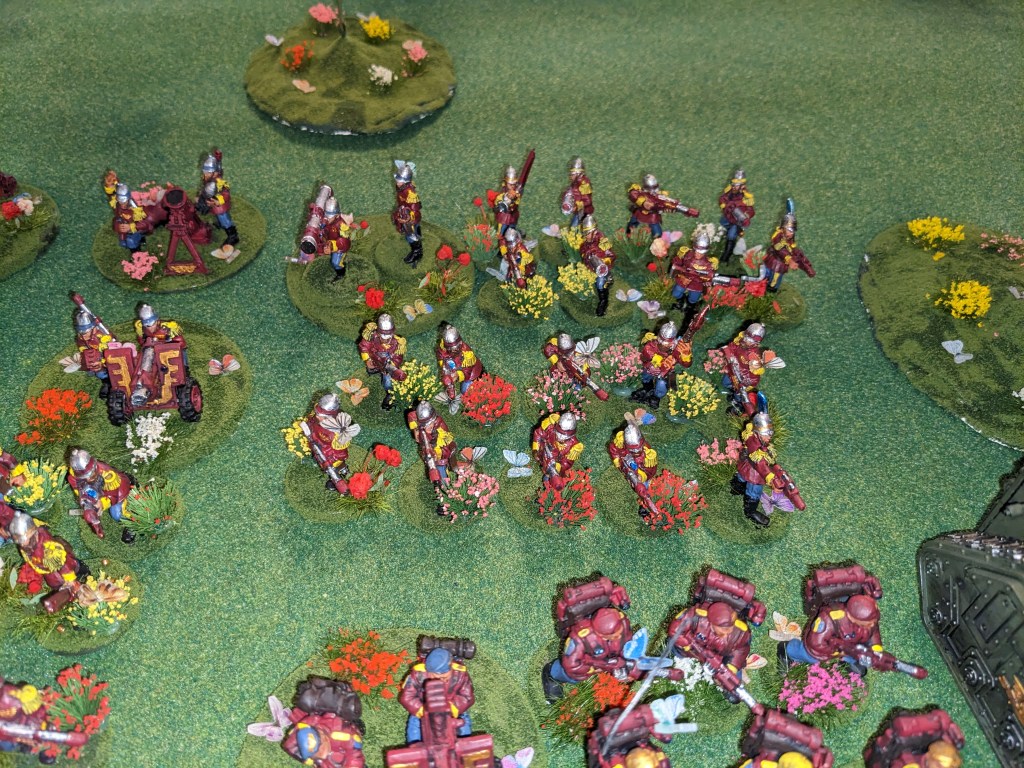 The Praetorian Guard do not get the love they deserve. They never really took off in popularity in the United States, and only seem to have a limited fan base in Europe. Basically they are British from a rank and file style shooting era. Alex was my lucky break on these, helping cover their cost as a birthday/Christmas present. I wanted to make them my fun army. I started with the stripes on their pants being bright yellow, as well as cuffs and shoulder pauldrons. I decided a decent blue and red uniform would keep it nice and clean. Lastly I settled on them being in bright silver and gold. The reason was since this regiment is not well known is because they are on a garden world (Valour Prime) not touched by war, acting as an honour guard from a long standing treaty. Partially because of some very well modified tanks I got on eBay, I decided the local emperor (Monarchy government, not a heretical emperor, just a corrupt one) on Valour Prime was corrupt and slowly traded off their equipment so they are stuck using old, stripped down gear and squandered their military resources. Forces have attempted to arm up using atmosphere restricted craft (using WW2 aircraft to grab that old feel) and whatever equipment they can scrounge.