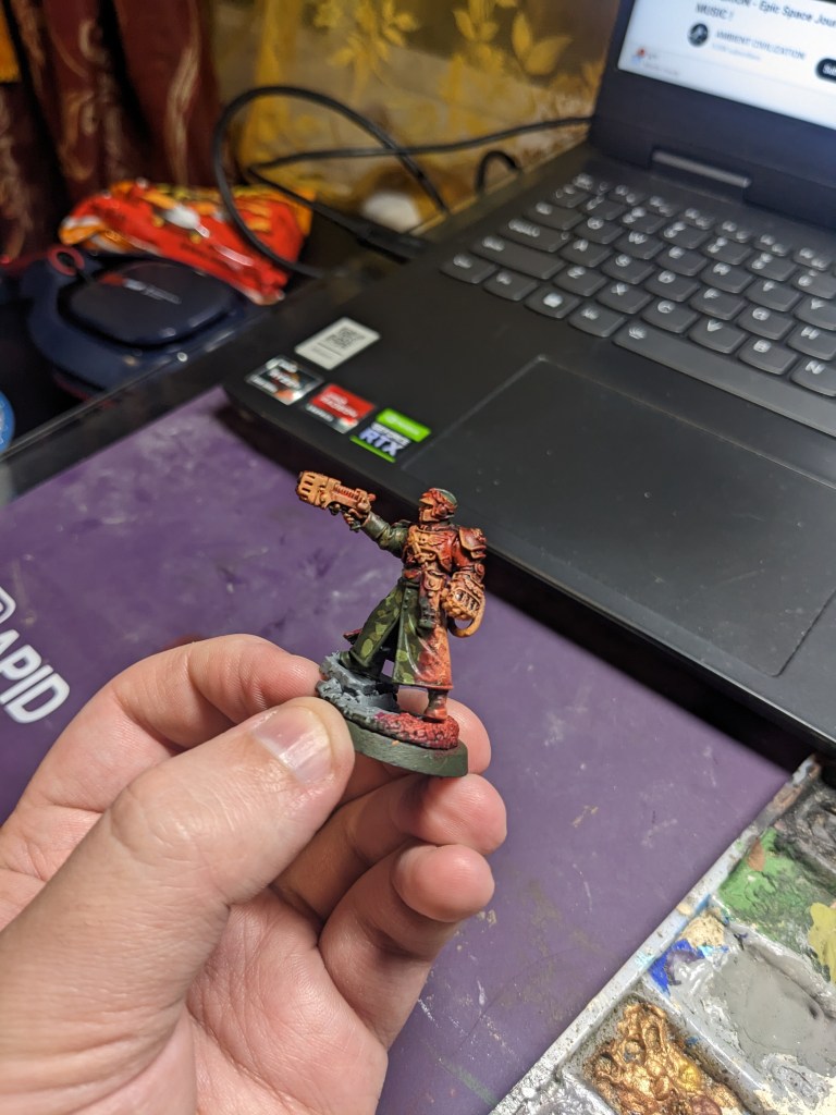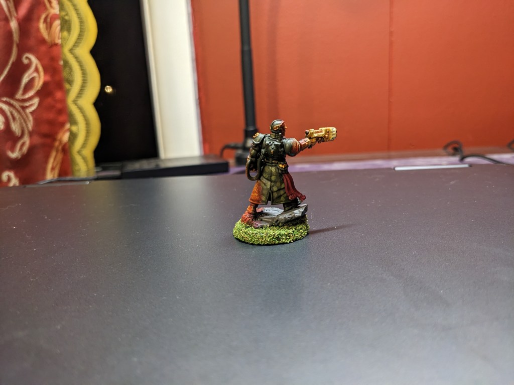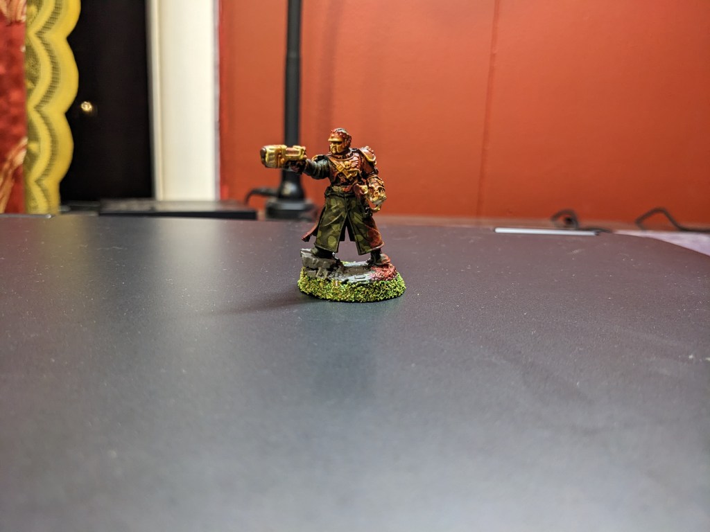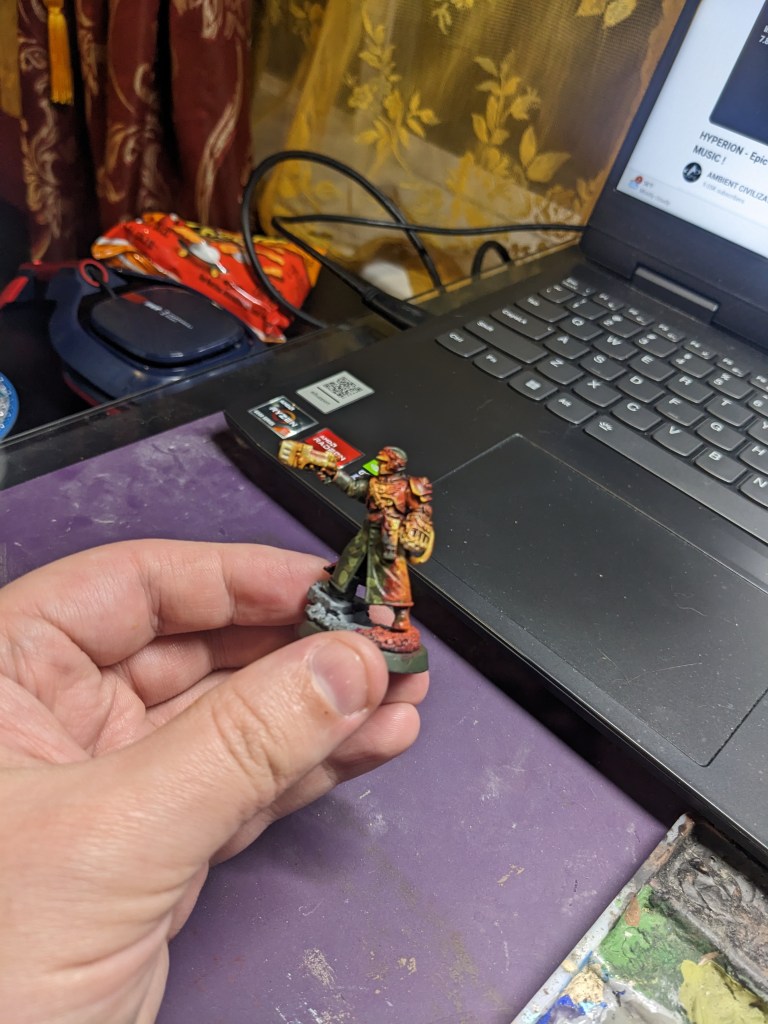 Lastly, I needed to do the coils. I’ve seen some cool coil videos, but they apply to deeper recesses than what this model had, so I went simple. I started with the darkest shade of yellow, Base Averland Sunset, and very carefully dry brushed it on the tops of the coils. I tested on the cloth to be safe. Then on top of that I did the same with the darkest Orange, Base Jokaero Orange, and then Base Khorne Red. The following came out okay, but I really was just focusing on the glow effect with this idea.