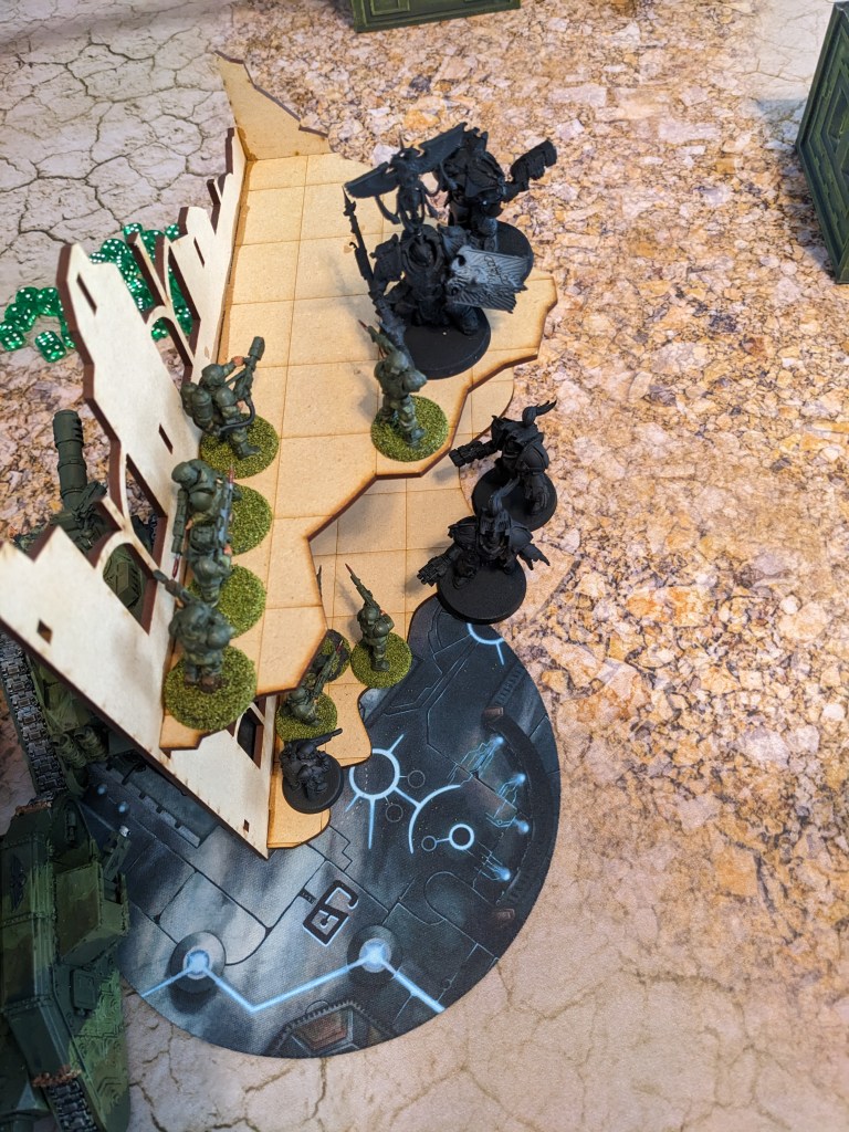 Captain General Trajann lead a unit of Guard right up the middle to the remains of the central command building. They quickly Advanced up to the building to keep in cover and use their stealth tactics until they were ready to fight. Two units of Aquilons were each accompanied by a Praetor in their teleporter chambers in orbit, ready to assist.